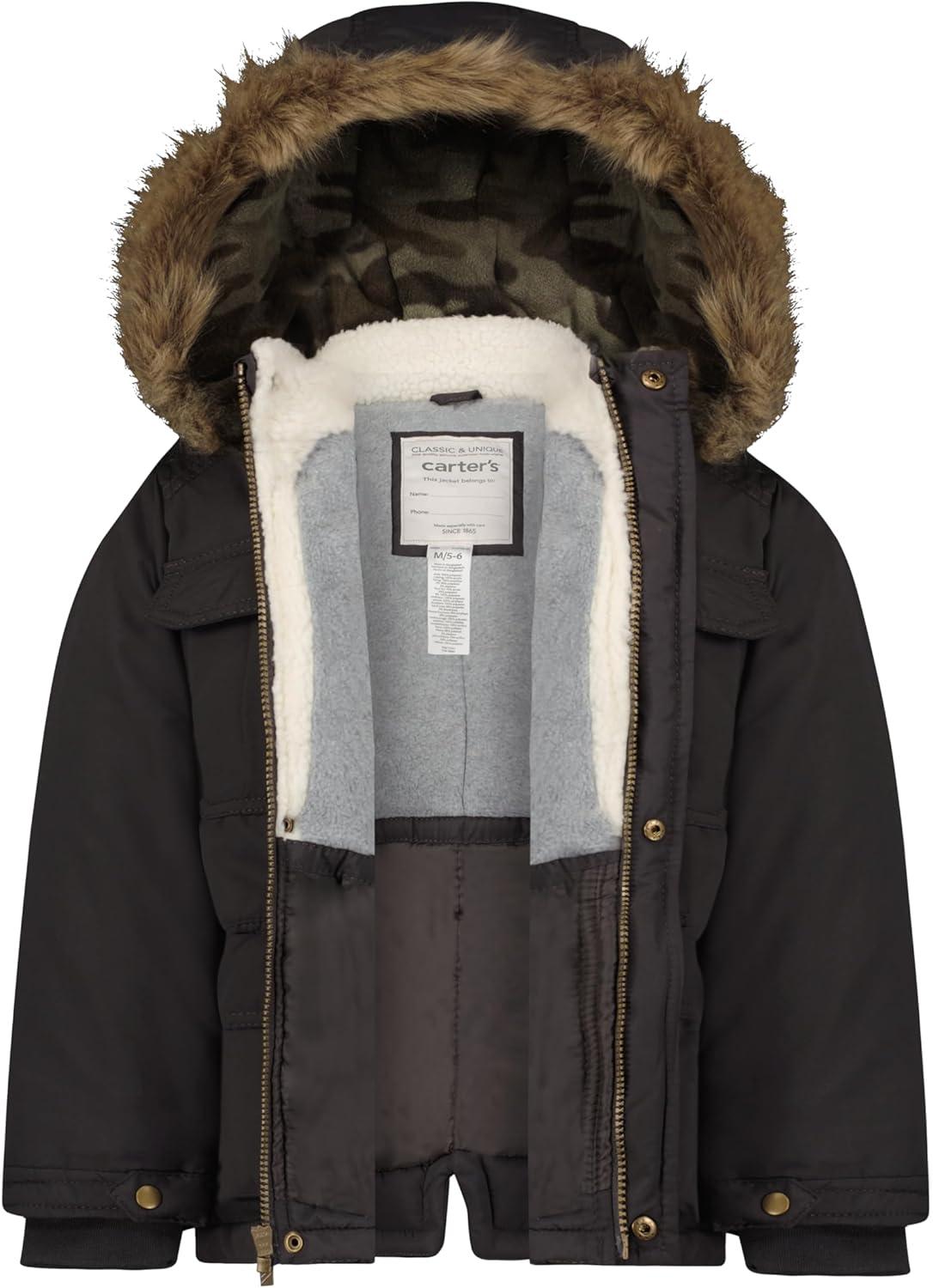 Perfect baby boy heavyweight winter jacket that you and your son will love. Keeps them warm on a cold winter day and has all of the features you expect in a Carter's jacket including water-resistant, attached hood with faux fir trim, fleece lining, storm flap over full front zipper, four pockets, and stylish design.